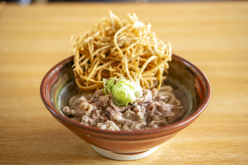 手切りした香りの良い細切りごぼうのかき揚げと、さっぱり味の肉。人気トッピング2種盛りのうどん。
