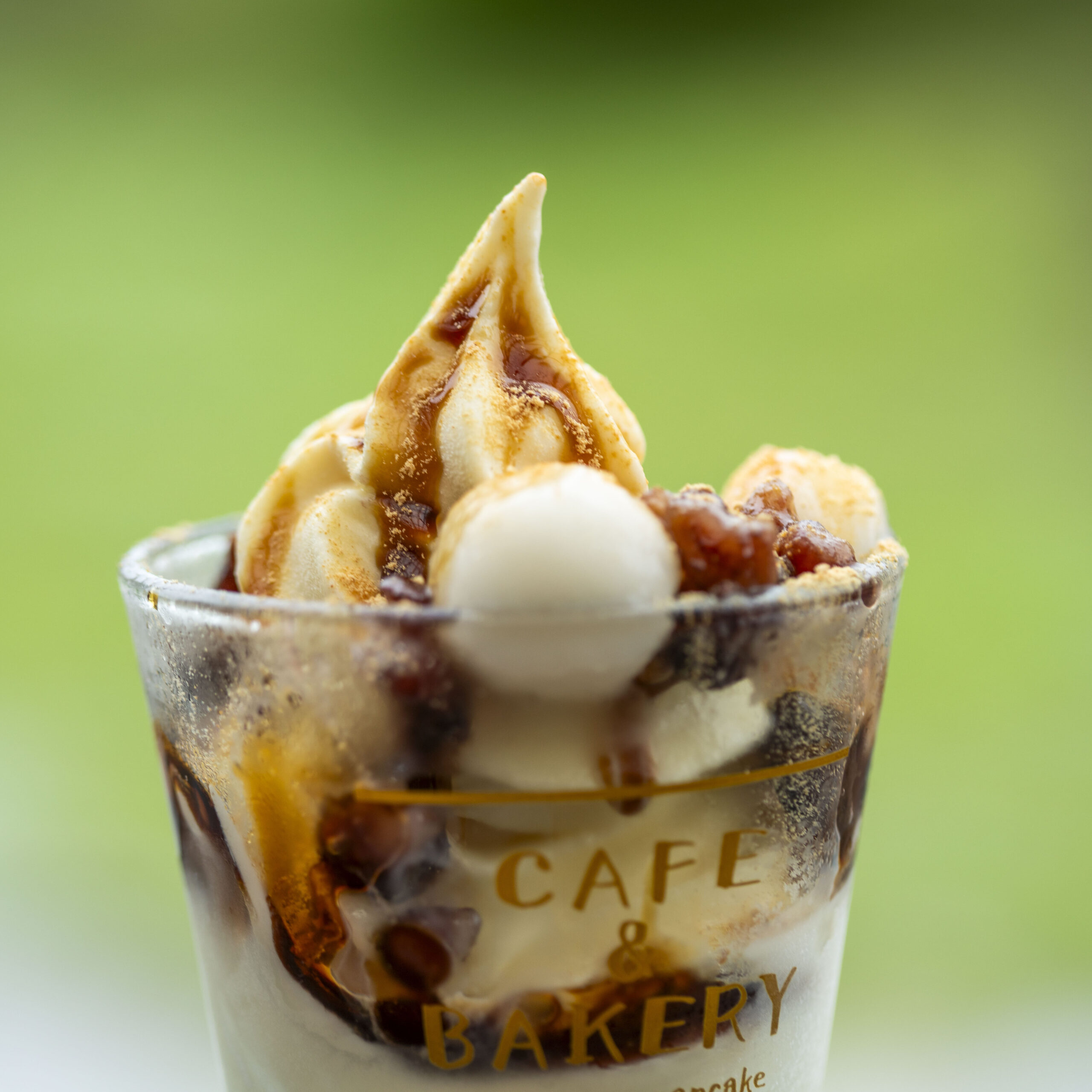自家製黒蜜をかけて白玉・きな粉と食べるリッチなソフト。